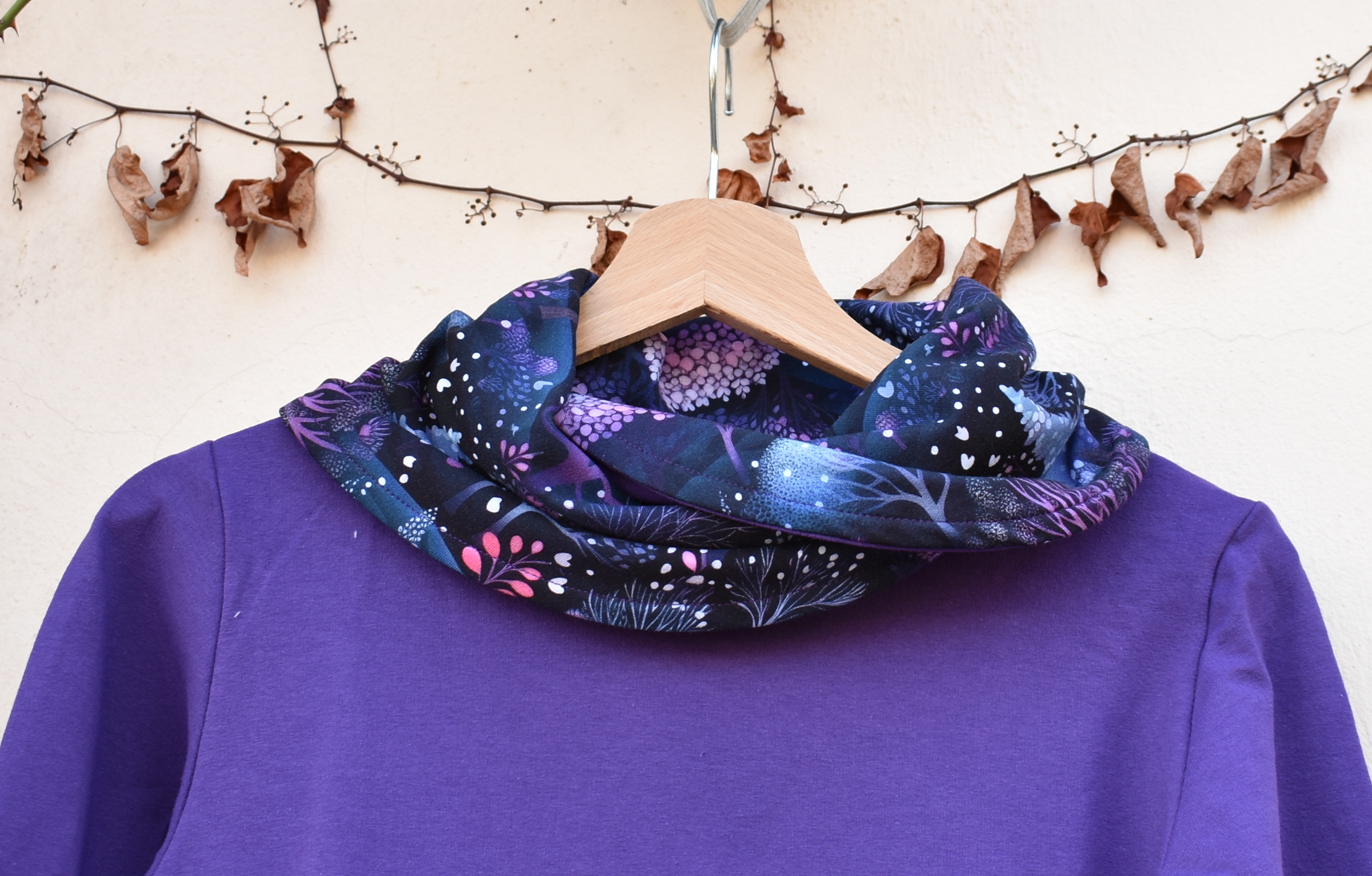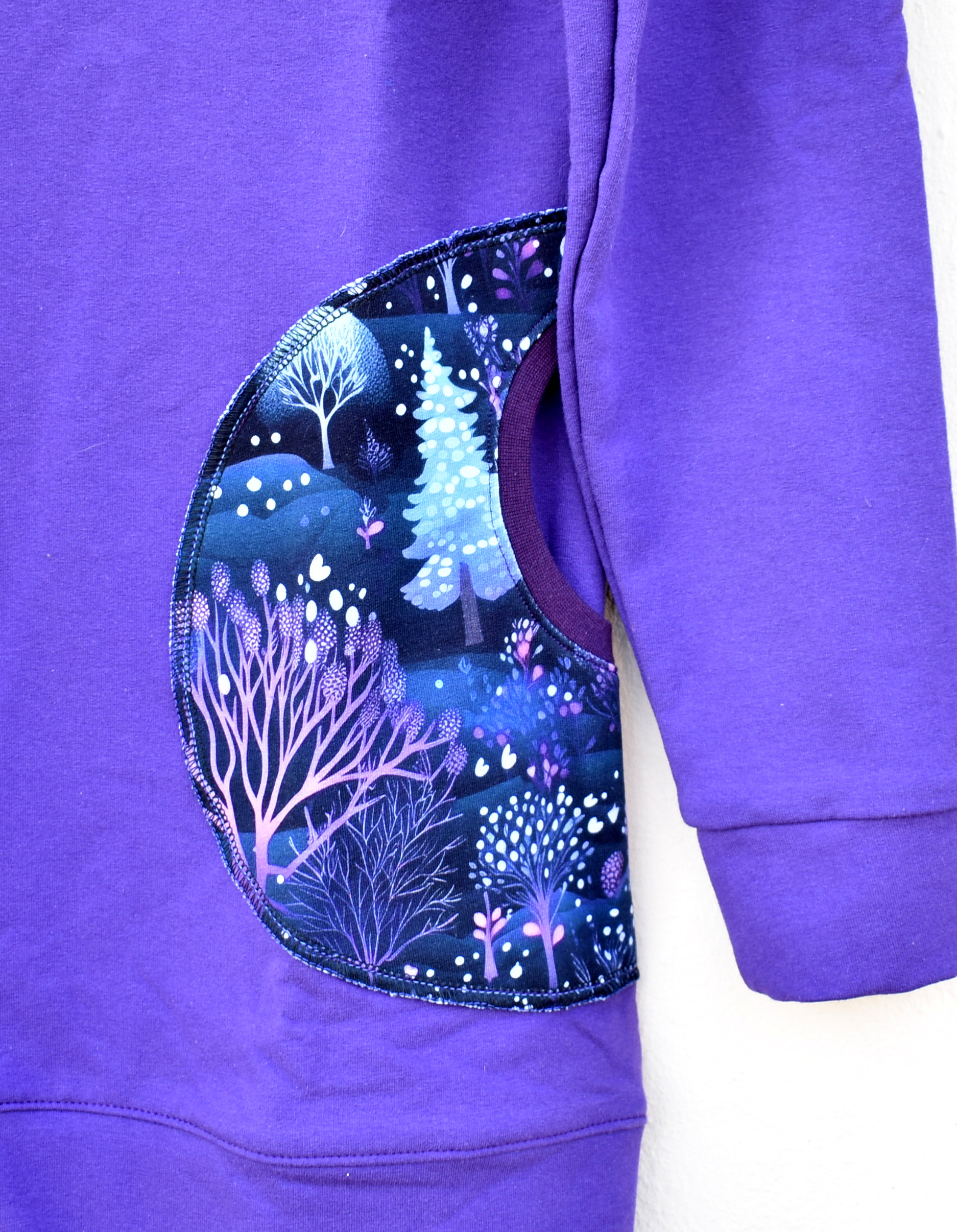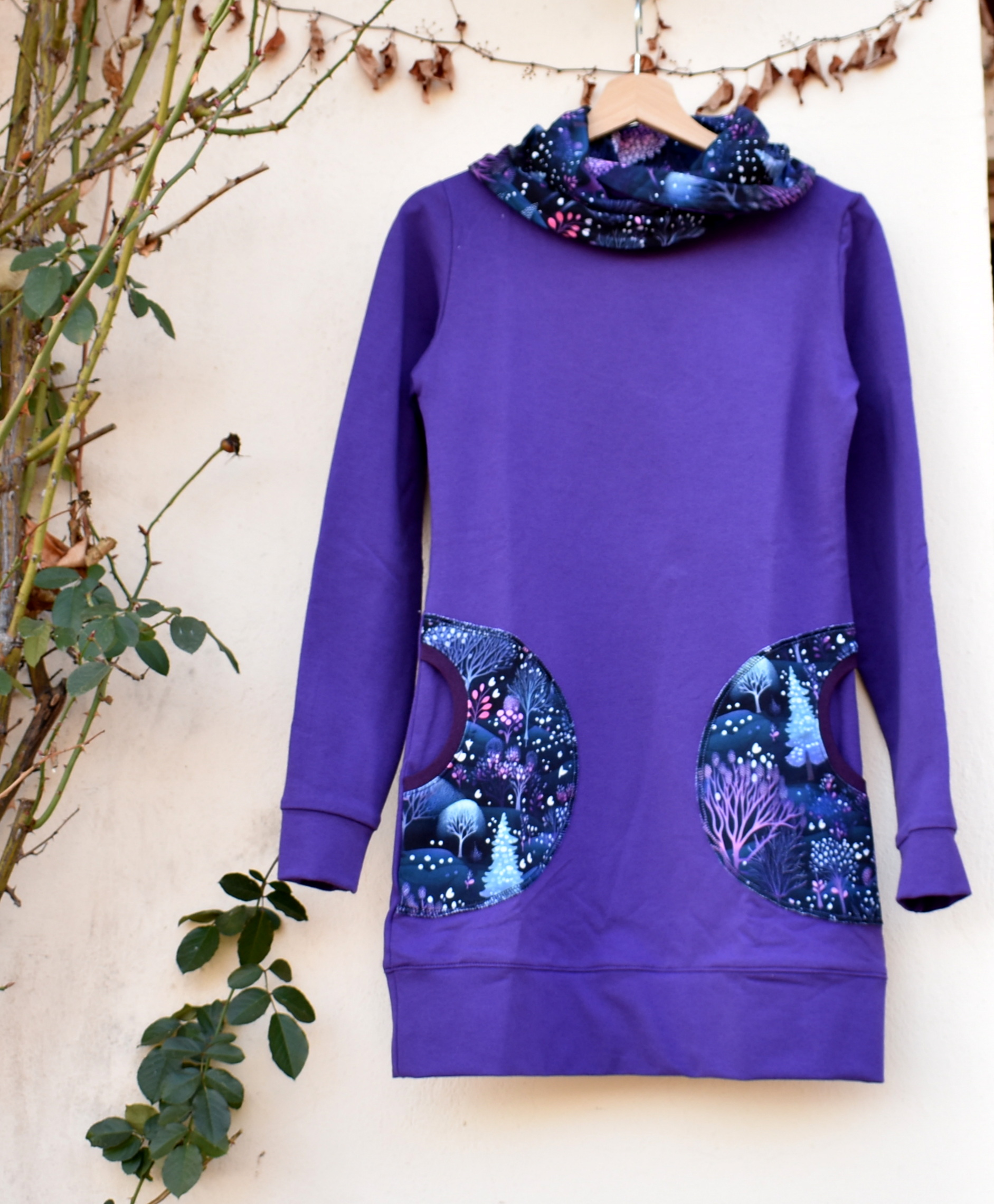 U krku je vysoký ohrnovací límec, 2 kapsy, dole staženo do širokého lemu.