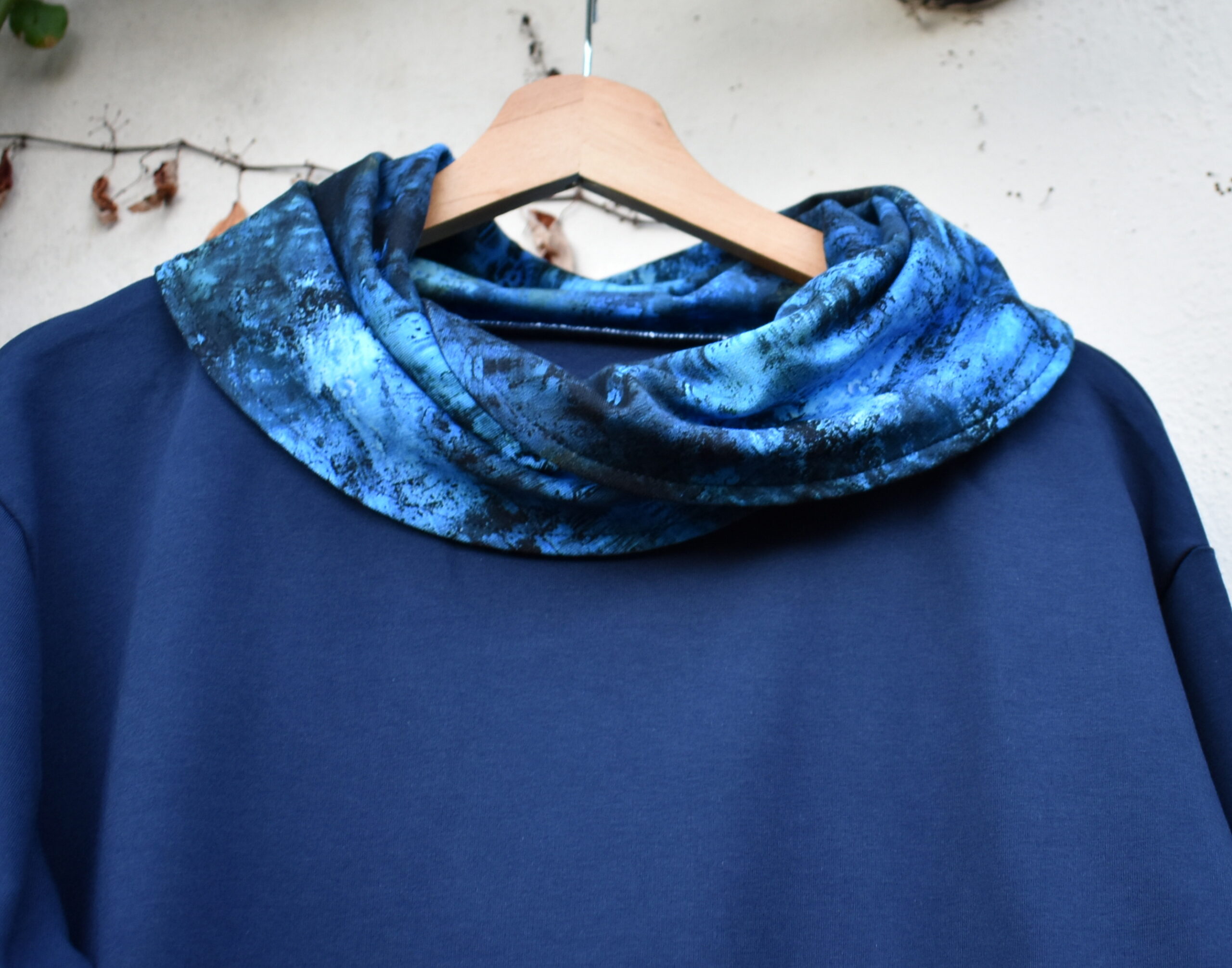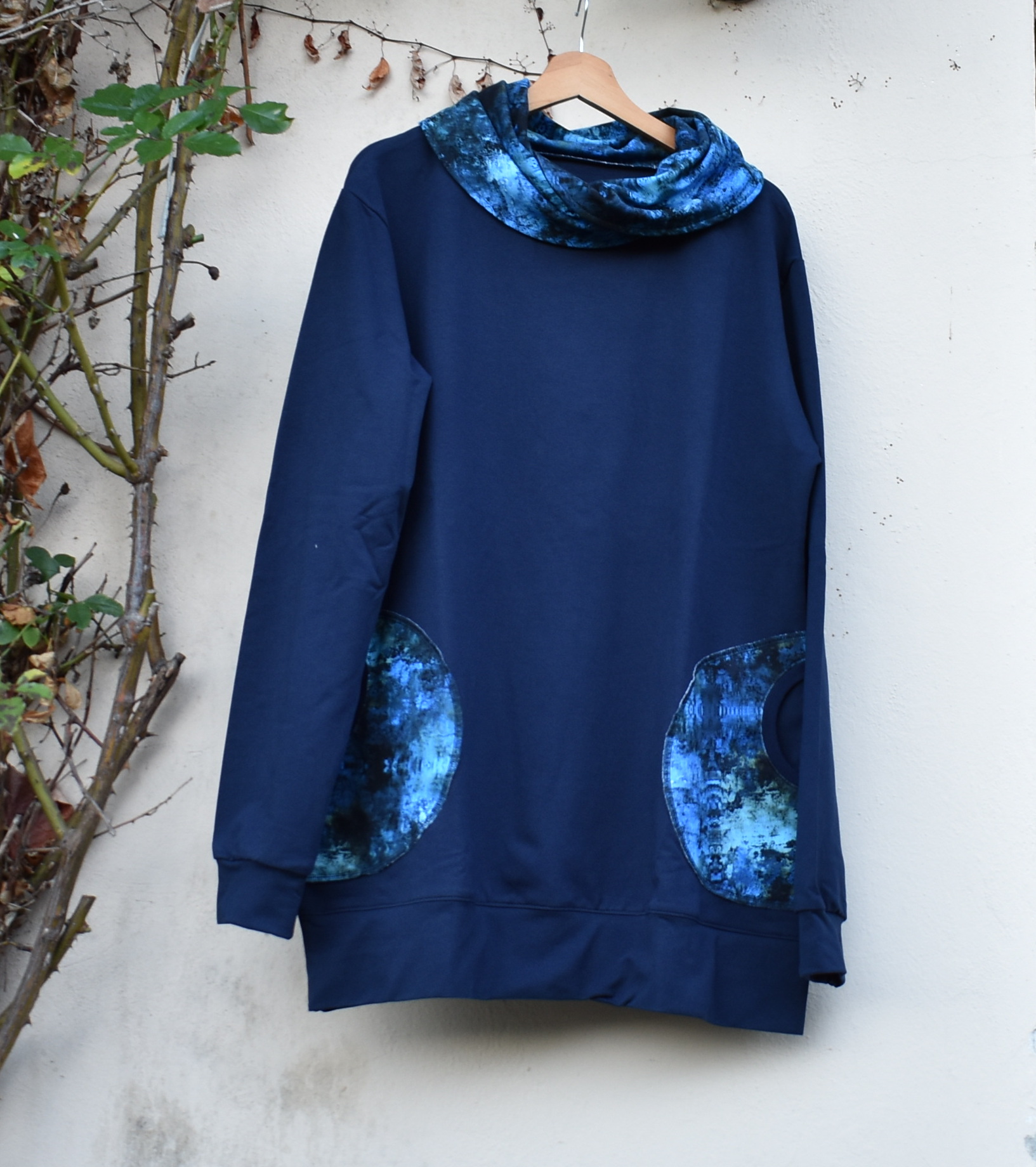 U krku je vysoký ohrnovací límec, 2 kapsy, dole staženo do širokého lemu.