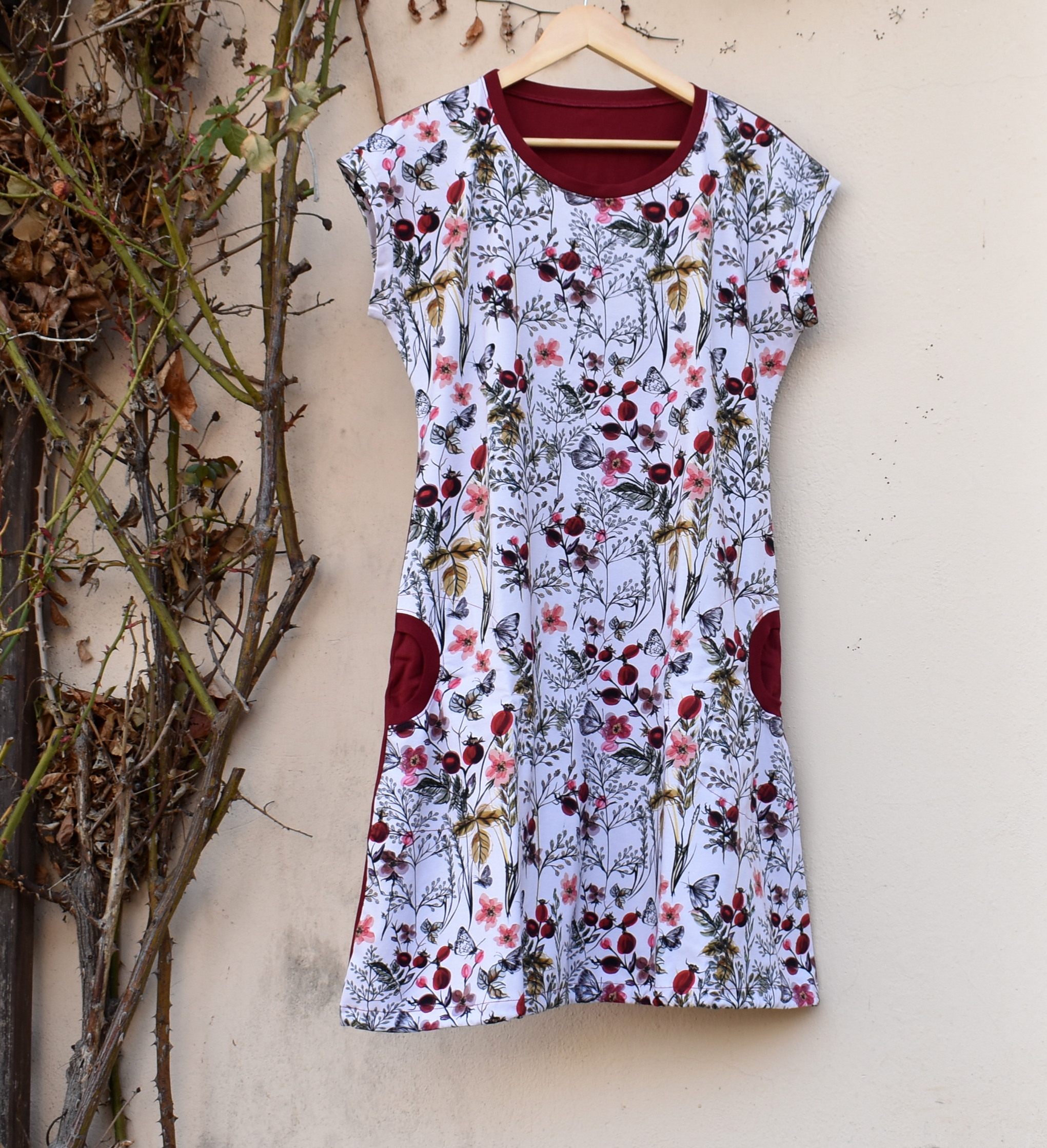 Pohodlné šaty z pružného úpletu. Šaty mají kapsy a dole stahovací šňůrku, která umožňuje nastavení podle potřeby.